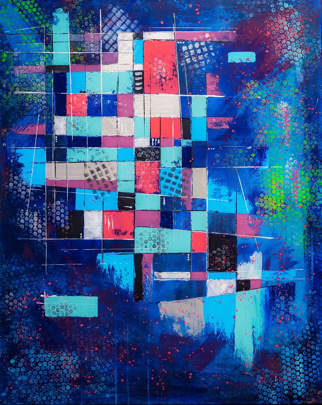 Nowoczesny obraz abstrakcyjny, namalowany na podobraziu malarskim o wymiarze 100 x 80 x 2 cm (wys. x szer. x gł.)