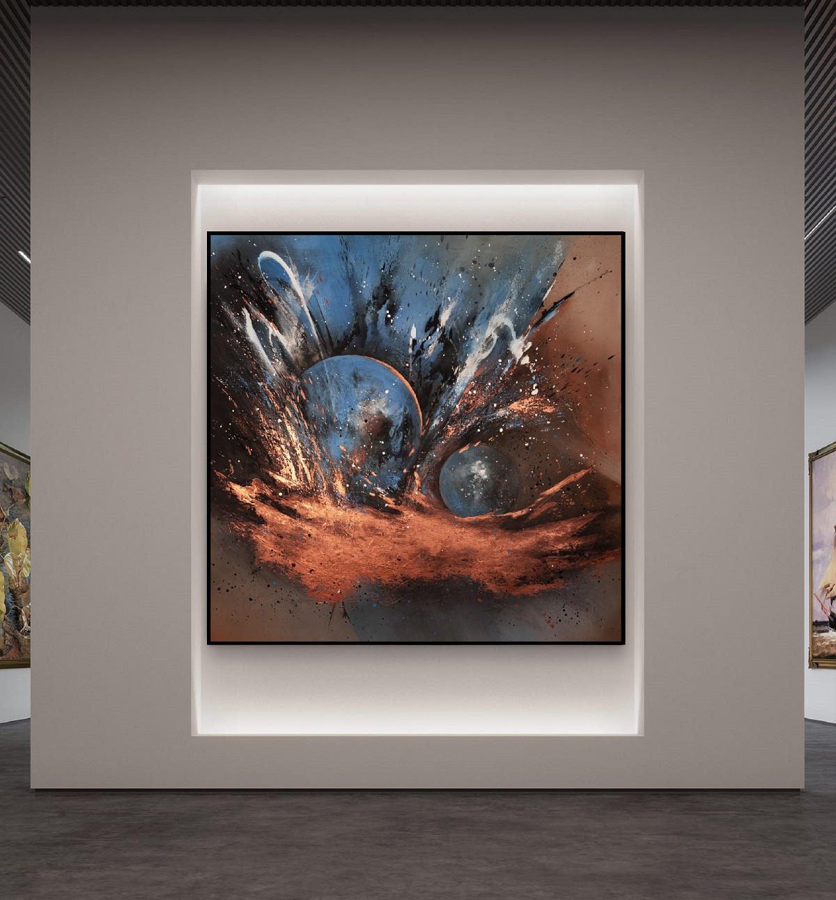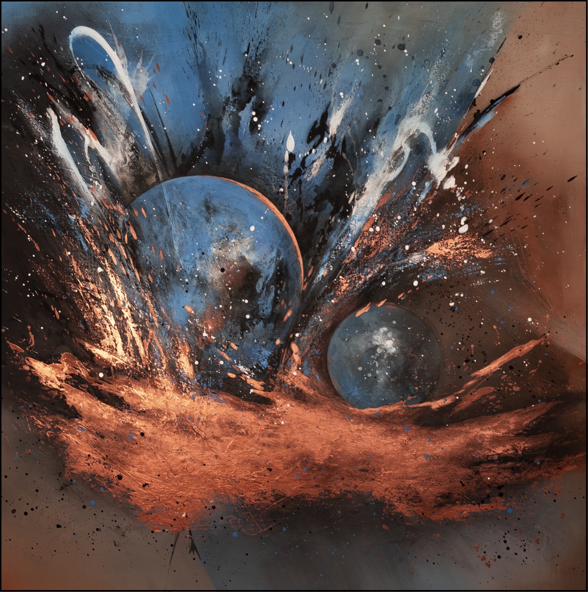 Nowoczesny obraz abstrakcyjny, namalowany na podobraziu malarskim o wymiarze 140 x 140 x 4 cm (wys. x szer. x gł.)
