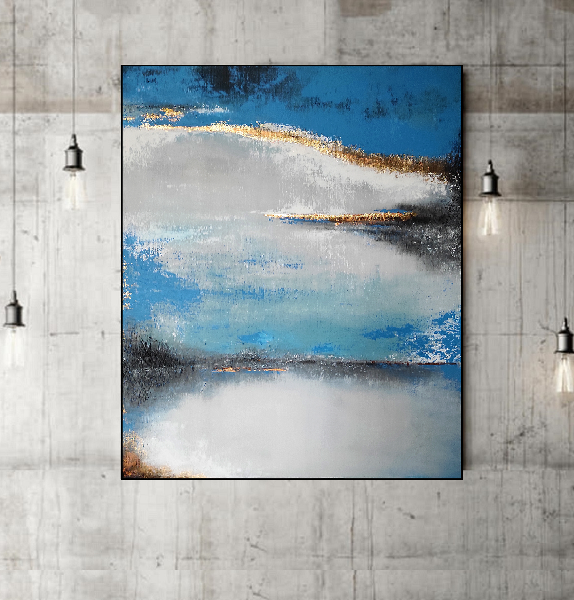 Nowoczesny obraz abstrakcyjny, namalowany na podobraziu malarskim o wymiarze 80 x 70 x 4 cm (wys. x szer. x gł.)